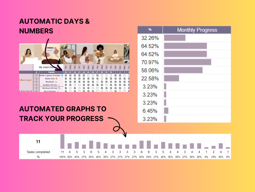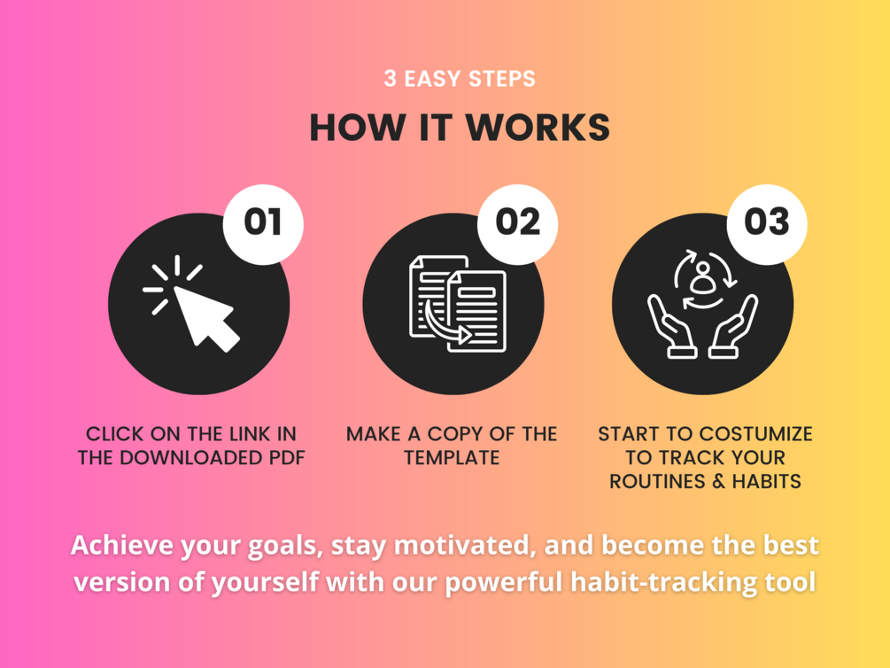 You'll receive a PDF File with a link to the Habit Tracker Google Sheet Habit Tracker (+ fully automated graphs to track daily & monthly progress) 📝 with Bonus List of Habits to become 'That Girl' 🌸