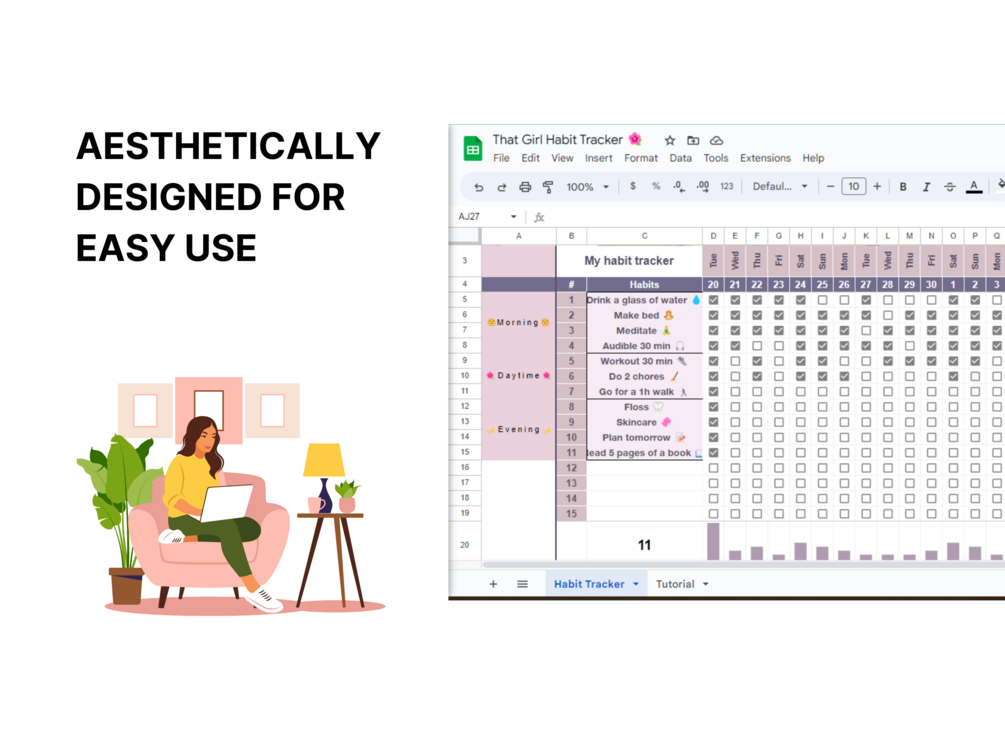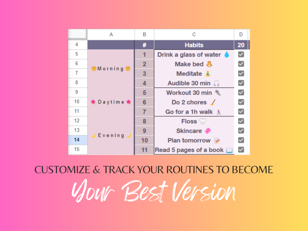 Our That Girl Habit Tracker Spreadsheet is the ultimate tool to help you efficiently keep track of your morning, daytime, and evening routines.