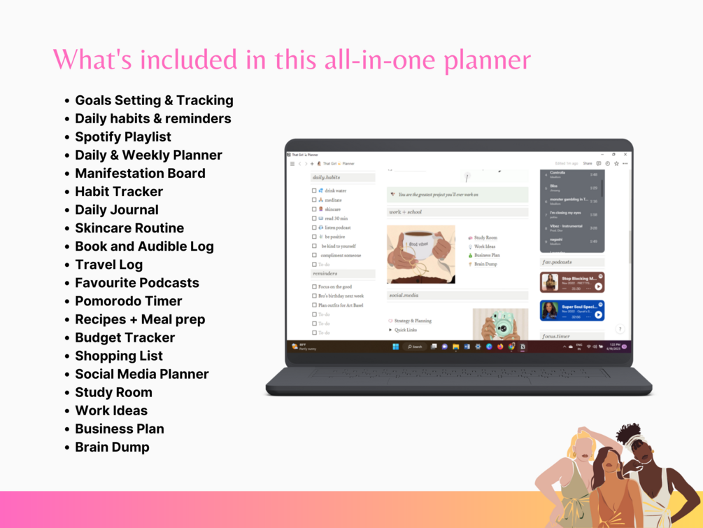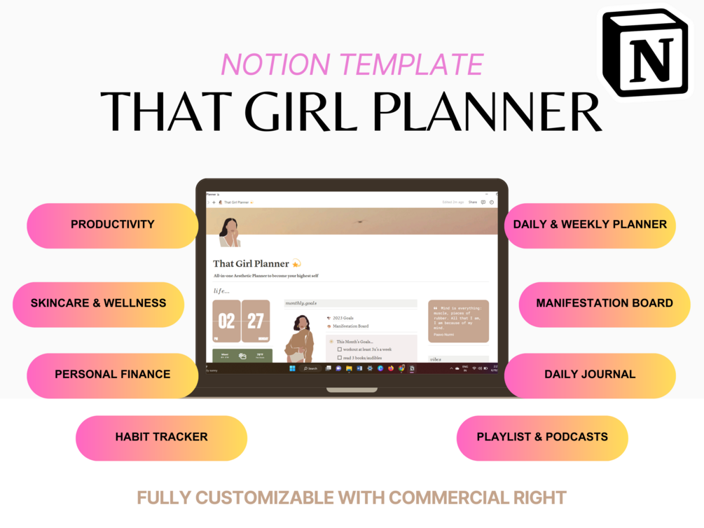Our "That Girl Notion Aesthetic Planner" is your passport to a more organized and fulfilling existence. Seamlessly integrate the following features into your daily routine: